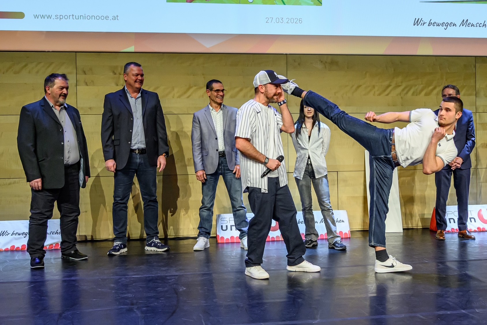 Ein besonderes Highlight des Abends war erneut der Auftritt von Diego: Wie schon im Vorjahr stellte er sich den Fragen des Moderators von „2:tages:bart“ und präsentierte anschließend eine Technik aus dem Kumite. Atemlose Stille erfüllte den Saal, als er mit einer explosiven Beintechnik nur wenige Zentimeter vor dem Gesicht des Moderators stoppte – eine beeindruckende Demonstration von Präzision, Schnelligkeit und absoluter Kontrolle. Die anschließende Erleichterung des Moderators sorgte für sichtbare Begeisterung im Publikum.